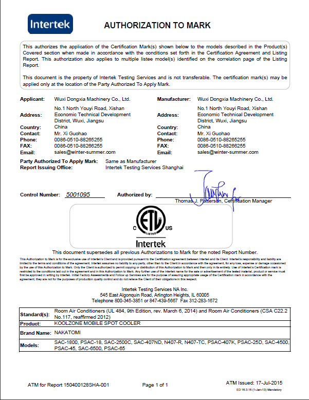 其实早在2012年华体会体育平台官方网站-华体会(中国)就已经取得3个机型的ETL认证证书,通过这次的证书的增补,现在华体会体育平台官方网站-华体会(中国)全系列的冷气机都已取得ETL认证,为公司今后加大美国市场的开拓步伐又增加了新的动力。目前华体会体育平台官方网站-华体会(中国)除了美国ETL认证,还取得了欧盟CE、日本PSE、中国CCC认证,这证明了无论从实用性还是安全性等各方面考虑,华体会体育平台官方网站-华体会(中国)的移动式工业冷气机都符合国内、国际多个标准,是值得消费者信任和选择的好产品。取得上述认证,是华体会体育平台官方网站-华体会(中国)实施海外市场产品战略迈出的又一重要步伐,此证也预示着华体会体育平台官方网站-华体会(中国)开拓海外市场的步伐日益加紧。